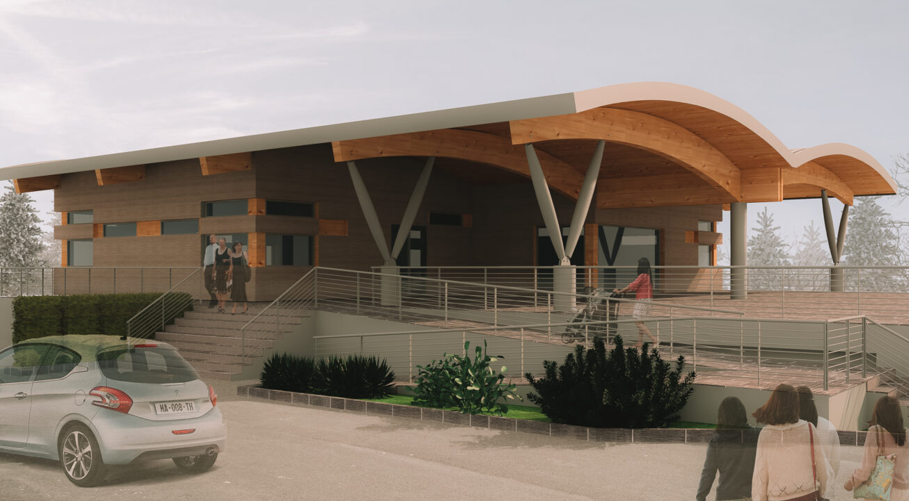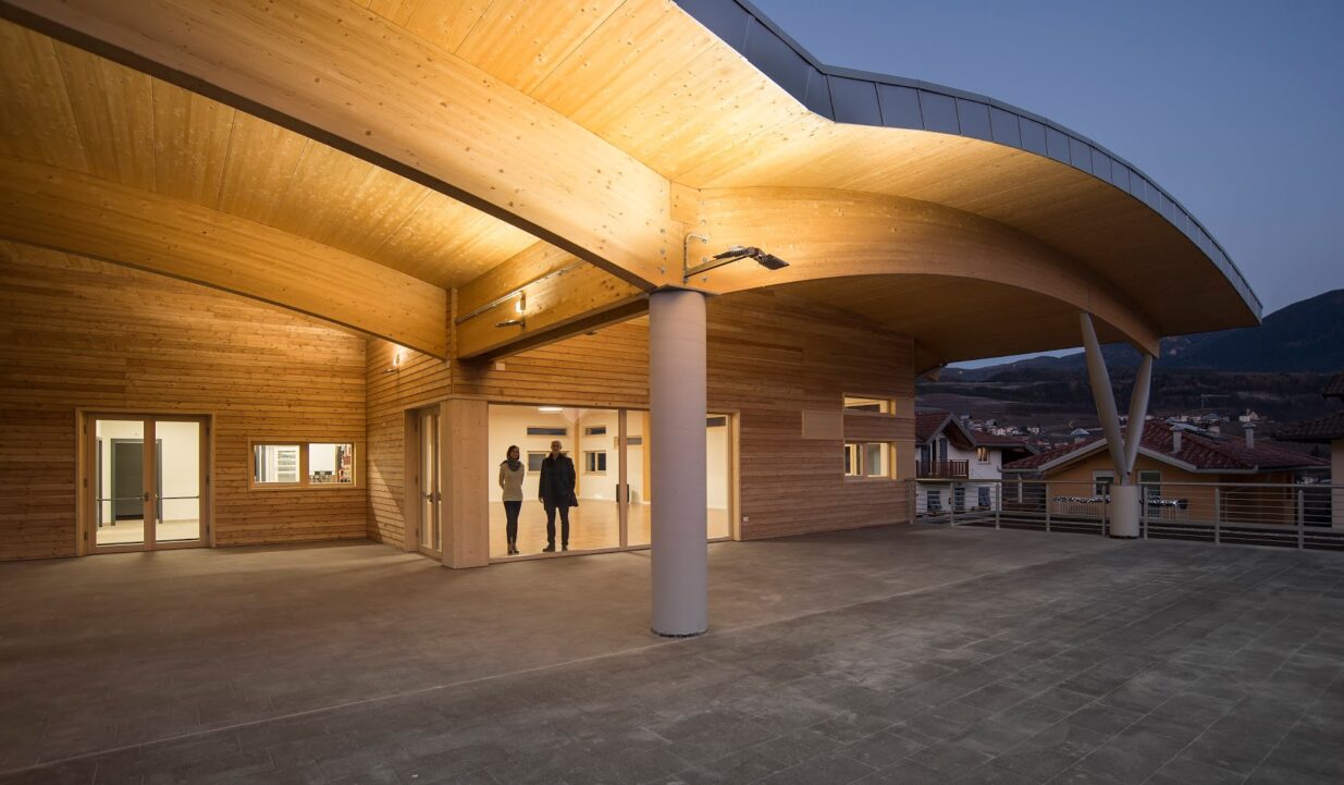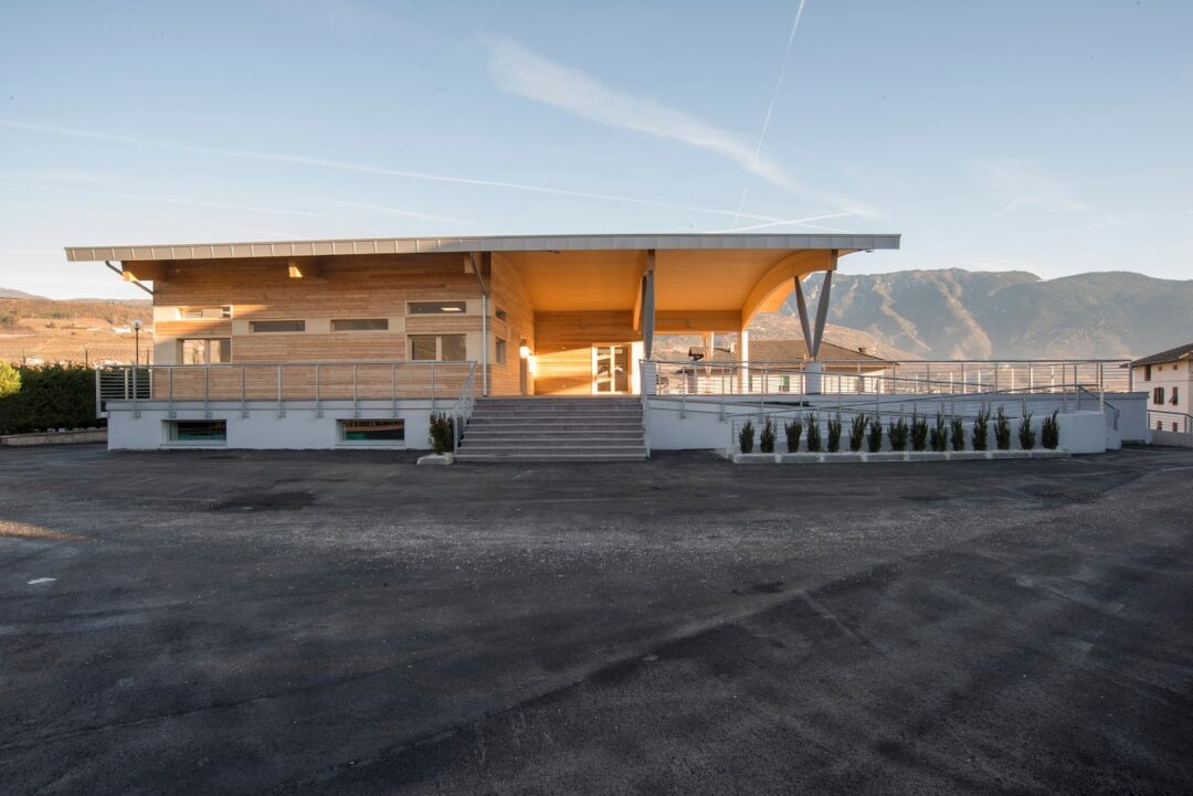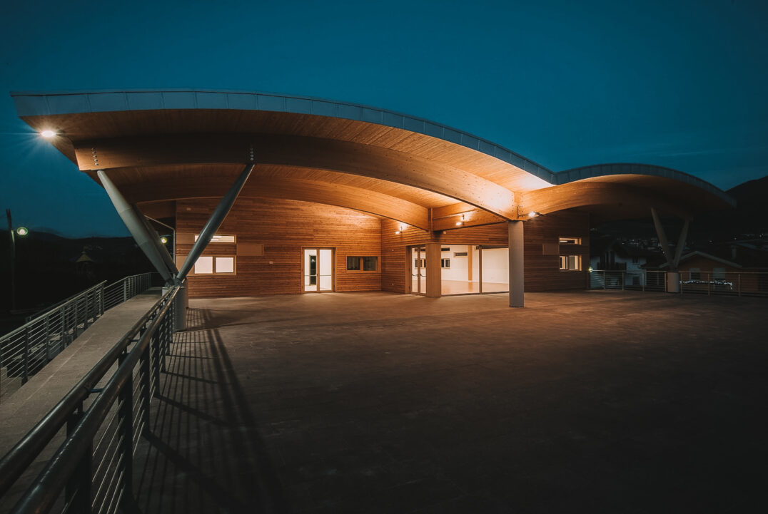 L’edificio si affaccia sulla vallata con una doppia copertura incurvata in legno lamellare, quasi come un uccello pronto a spiccare il volo.