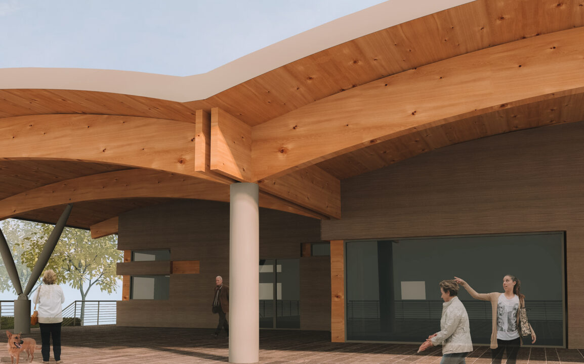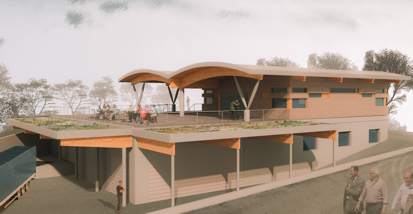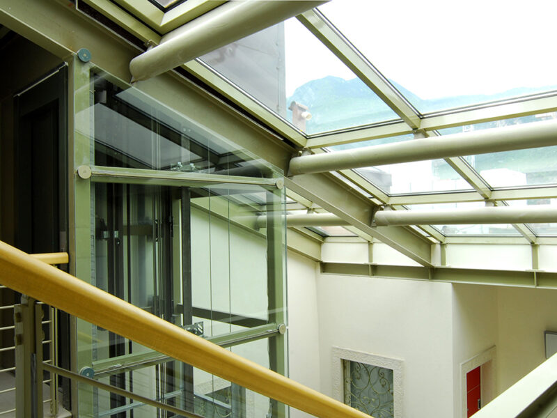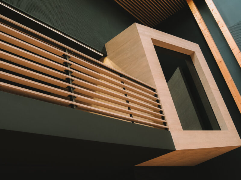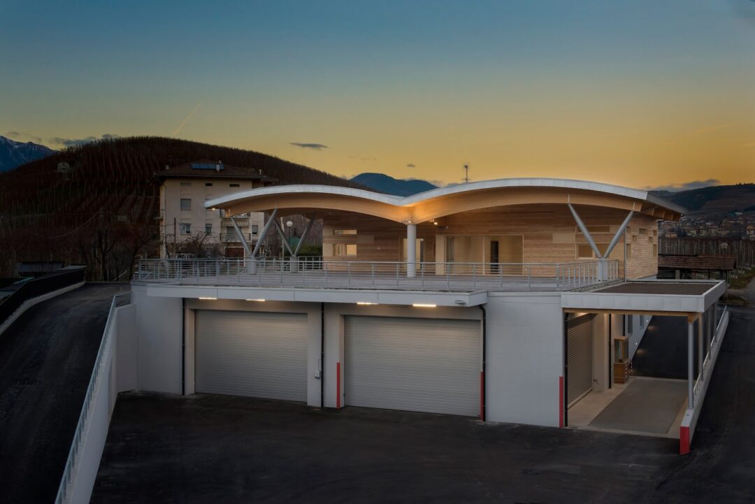 L’edificio si affaccia sulla vallata con una doppia copertura incurvata in legno lamellare, quasi come un uccello pronto a spiccare il volo.